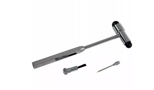 Młotek neurologiczny Buck Hammer z igłą i pędzelkie to trwały i wygodny klasyczny młotek neurologiczny do badania neurologicznego pacjenta. Młotek Buck jest niezbędnym wyposażeniem każdego terapeuty i lekarza. Głowica młotka jest wyposażona w dużą i małą końcówkę, dzięki czemu możliwe jest przeprowadzenie bezbolesnego i precyzyjnego badania neurologicznego i ortopedycznego pacjenta. Młotek neurologiczny posiada zintegrowany szpikulec wkręcany w głowicę oraz pędzelek wkręcany w rękojeść.