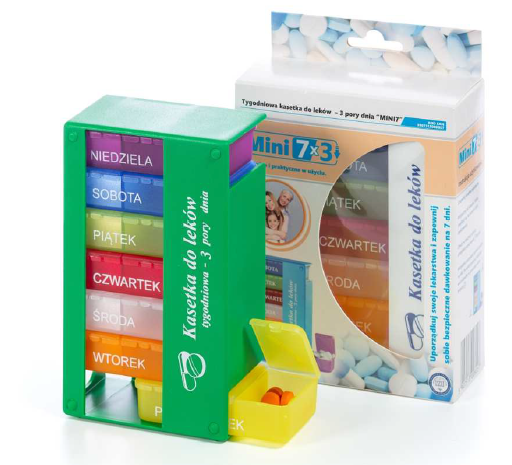 Wygodna kasetka na leki pozwalająca na przechowywanie leków w uporządkowany sposób dzięki podziałowi na 7 dni tygodnia i 3 pory dnia, rano, południe i wieczór. Oddzielne komory pozwalają na rozłożenie leków zgodnie z zalecanymi dawkami. Dzięki temu chory uniknie pomyłki w przyjmowaniu leków 3 razy dziennie. Każda komora jest podzielona i czytelnie opisana na 7 dni tygodnia od poniedziałku do niedzieli z wyszczególnieniem pory dnia. Świetnie sprawdza się w przypadku, gdy chory ma problem z samodzielnym rozkładaniem i dozowaniem leków. Zaletą użytkowania takiego organizera jest możliwość rozplanowania przyjmowania leków na cały tydzień. Dzięki podziałowi na dni tygodnia i pory dnia nie ma możliwości pomyłki w przyjmowaniu tabletek. Produkt przeznaczony jest zarówno do użytku domowego jak i w warunkach domowej opieki, w szpitalu czy innych placówkach opiekuńczo-leczniczych. Kompaktowy rozmiar zapewnia wygodę użytkowania w przyjmowaniu medykamentów podczas podróży. Pojemnik na leki został wykonany z trwałego i lekkiego materiału.