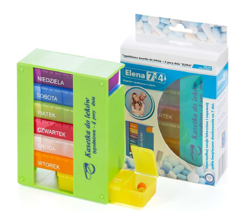 Wygodna kasetka na leki pozwalająca na przechowywanie leków w uporządkowany sposób dzięki podziałowi na 7 dni tygodnia i 4 pory dnia. Oddzielne komory pozwalają na rozłożenie leków zgodnie z zalecanymi dawkami. Dzięki temu chory uniknie pomyłki w przyjmowaniu leków 4 razy dziennie. Każda komora jest podzielona i czytelnie opisana na 7 dni tygodnia od poniedziałku do niedzieli z wyszczególnieniem pory dnia. Świetnie sprawdza się w przypadku, gdy chory ma problem z samodzielnym rozkładaniem i dozowaniem leków. Zaletą użytkowania takiego organizera jest możliwość rozplanowania przyjmowania leków na cały tydzień. Dzięki podziałowi na dni tygodnia i pory dnia nie ma możliwości pomyłki w przyjmowaniu tabletek. Produkt przeznaczony jest zarówno do użytku domowego jak i w warunkach domowej opieki, w szpitalu czy innych placówkach opiekuńczo-leczniczych. Kompaktowy rozmiar zapewnia wygodę użytkowania w przyjmowaniu medykamentów podczas podróży. Pojemnik na leki został wykonany z trwałego i lekkiego materiału.
