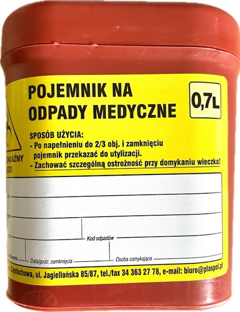 Pojemnik na ostre odpady medyczne, jednorazowy, czerwony- 0,7L.