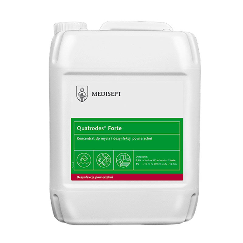Quatrodes® Forte to wydajny koncentrat do jednoczesnego mycia i dezynfekcji nieinwazyjnych wyrobów medycznych jak unity, łóżka i fotele zabiegowe, stoły operacyjne, aparatura medyczna. Ze względu na wysoką tolerancję materiałową idealnie nadaje się do dezynfekcji materiałów obiciowych oraz wyrobów z tworzywa ABS, szkła, porcelany, gumy, stali szlachetnej oraz aluminium, niklu i chromu. Zalecany jest także do dezynfekcji poprzez zanurzenie oraz do wyrobów medycznych ze szkła akrylowego. Innowacyjna formuła oparta na synergii surfaktantów i technologii nano-micelli zapewnia szerokie spektrum działania w krótkim czasie i wyjątkowe właściwości myjące. Nie zawiera aldehydów i fenoli, dzięki czemu nie wywołuje reakcji alergicznych i nie odbarwia powierzchni. Nie wymaga spłukiwania. Posiada przyjemny, kwiatowy zapach.