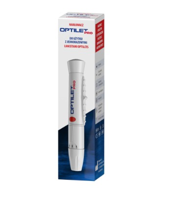 Nakłuwacz Optilet Pro to wyrób medyczny do użycia z lancetami w celu punktowego nakłucia skóry i uzyskania próbki krwi.