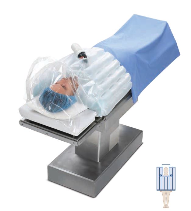 - Dołączona przezroczysta serweta foliowa na głowę utrzymuje ciepłe powietrze wokół głowy zaintubowanego pacjenta zmniejszając straty ciepła i umożliwia lekarzowi obserwację pacjenta