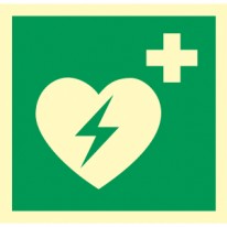 Znak ewakuacyjny DEFIBRYLATOR (AED) wskazuje miejsce, gdzie znajduje się urządzenie do przywrócenia akcji serca.